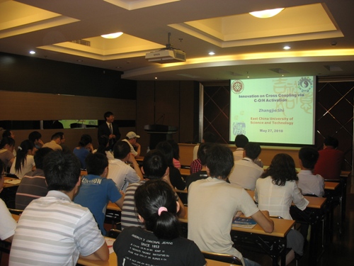 应钱旭红校长的邀请,北京大学化学与分子工程学院教授、国家杰出青年科学基金获得者施章杰教授来我校进行学术交流并于5月27日上午在实验18楼315会议室作了题为“Innovation on Cross Coupling via C-O/H Activation”的学术报告,报告由钱校长主持,2138cn太阳集团古天乐和化学院师生100余人聆听了报告。在1个小时的报告中,施章杰教授详细介绍了他们研究小组近年来在过渡金属催化的C-O/C-H 键活化方面的研究进展,阐明了如何通过改变金属、配体、酸碱性等条件来调控反应活性及选择性,并展望了C-O/C-H 键活化研究的前景。报告结束后,老师和同学们踊跃提问,施教授就大家的提问做了详细的解答和深入交流,会气氛异常热烈,施教授风趣的讲解也博得师生们的阵阵掌声。