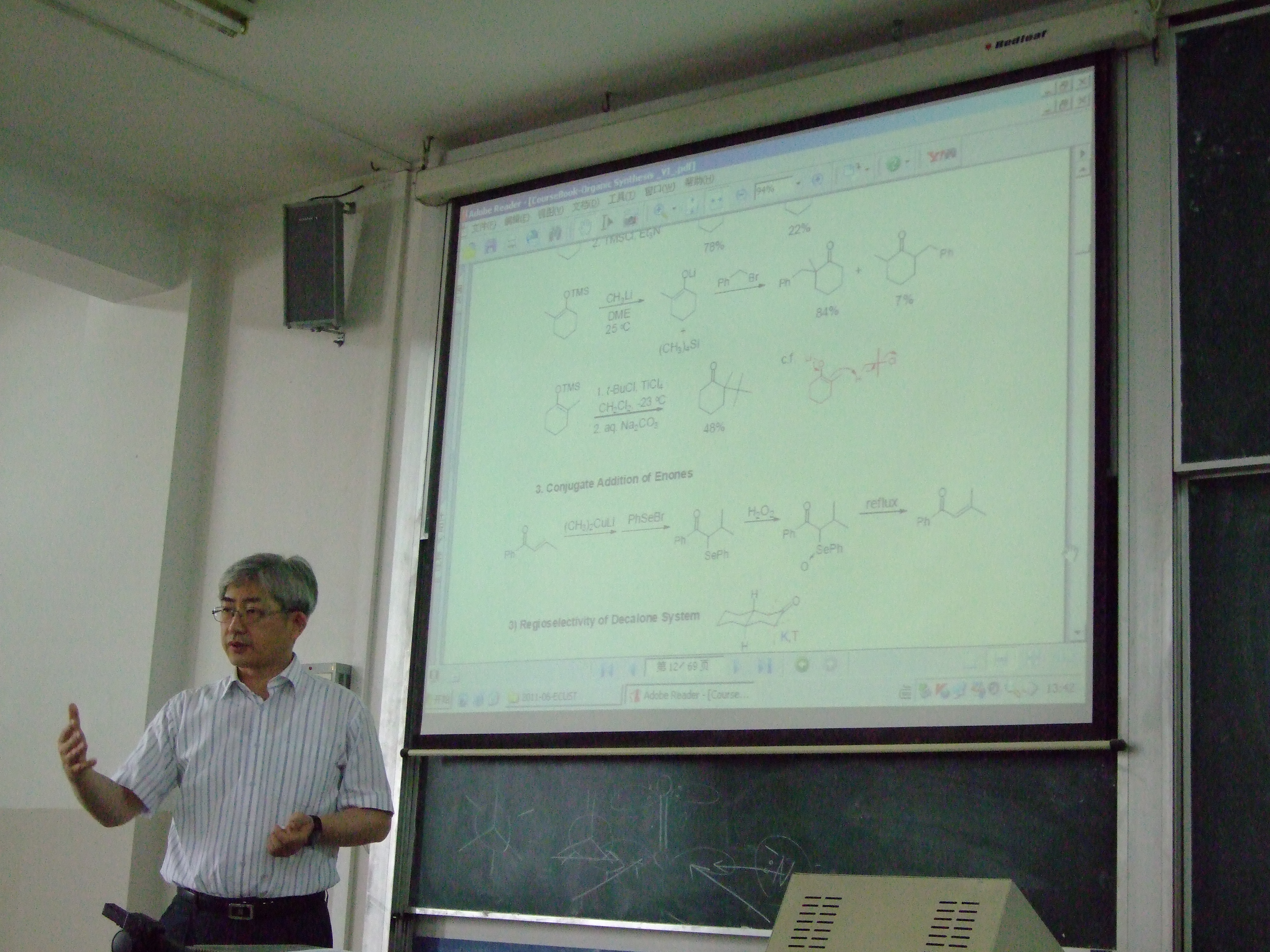 在将近一个星期的的学术讲座中,Sangho Koo 教授向学生讲述了有机合成的方法,并对碳-碳单/双键和环化反应的合成方法做了详尽的介绍,并结合教授本人的研究方向,对其中的硫参与的碳-碳单/双键和合成作了进一步的解释。在碳-碳单键的介绍过程中,着重强调了烯醇化的重要性以及方法。通过对六圆环过渡态和非环状过渡态的分析,对烯醇化过程中会遇到的选择性问题做了细致的比较和解释。在对碳-碳双键的合成方法的阐述中,由ß-取代反应出发,之后介绍了Wittig反应和与其相联系的Schlosser 反应, Horner-Wadsworth-Emmons 反应和Hormer-wittig反应。在环化反应中,强调了Claisen 重排以及其空间选择性的控制。通过轨道理论对Diels-Alder反应,并结合取代基对双烯体和亲双烯体的影响从机理上进行了解释。Sangho Koo 教授的讲座内容丰富多彩,学生对其内容产生了浓厚的兴趣。每次讲座结束后,Sangho Koo 教授多会和学生进行互动探讨交流,并耐心、细致地回答讲座过程的疑问。