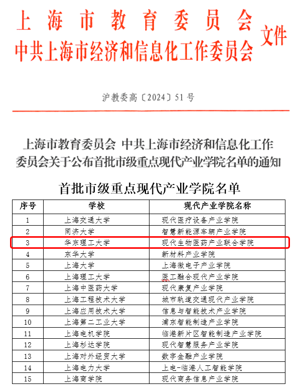 自2021年现代生物医药产业联合学院入选上海首批市级重点现代产业学院建设项目,2022年入选首批国家级现代产业学院名单,近日又顺利通过验收,成功获批为首批上海市级重点现代产业学院。